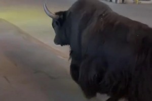 女子在街上遇到一头耗牛,女子和耗牛沟通耗牛一直甩头!